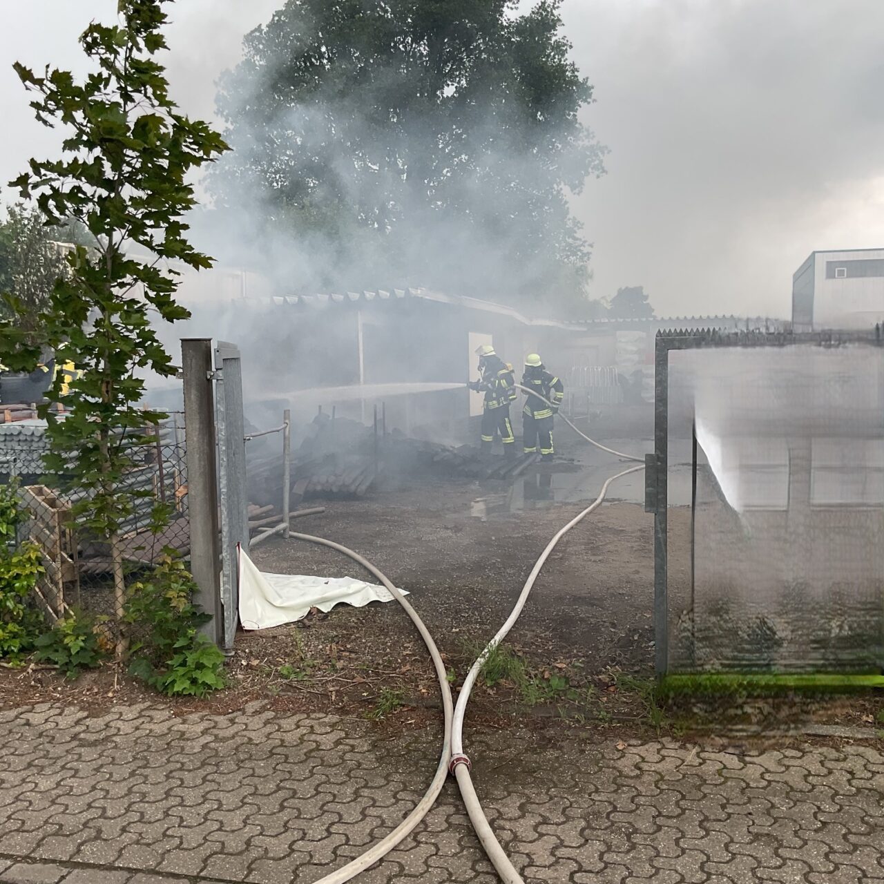 Vor Ort erkundeten wir den Bereich schnell und bereiteten einen Löschangriff vor. Unmittelbar nach unserer Ankunft wurde mit der Brandbekämpfung begonnen. Wir wurden vom LöschzugLoikumWertherbruch mit weiteren Einsatzkräften und Atemschutzgeräteträgern unterstützt. Auch der ELW1LöschzugBrünen und der ELW2KreisWesel waren zur Unterstützung an der Einsatzstelle. Zeitweise wurde mit drei Trupps unter Atemschutz und drei C-Rohren die Brandbekämpfung durchgeführt. Das Feuer war schnell unter Kontrolle, sodass ein Übergreifen auf benachbarte Gebäude und Fahrzeuge verhindert werden konnte. Nach einer abschließenden Kontrolle mit einer Wärmebildkamera begannen wir mit den Aufräumarbeiten. Verletzt wurde hierbei niemand, etwa 30 Kräfte waren für rund 1,5 Stunden im Einsatz.