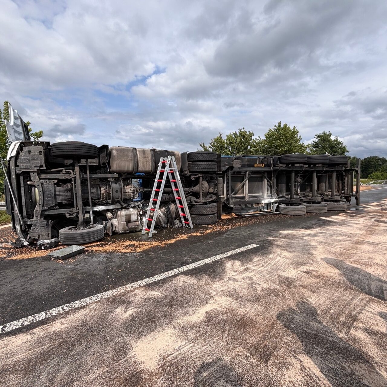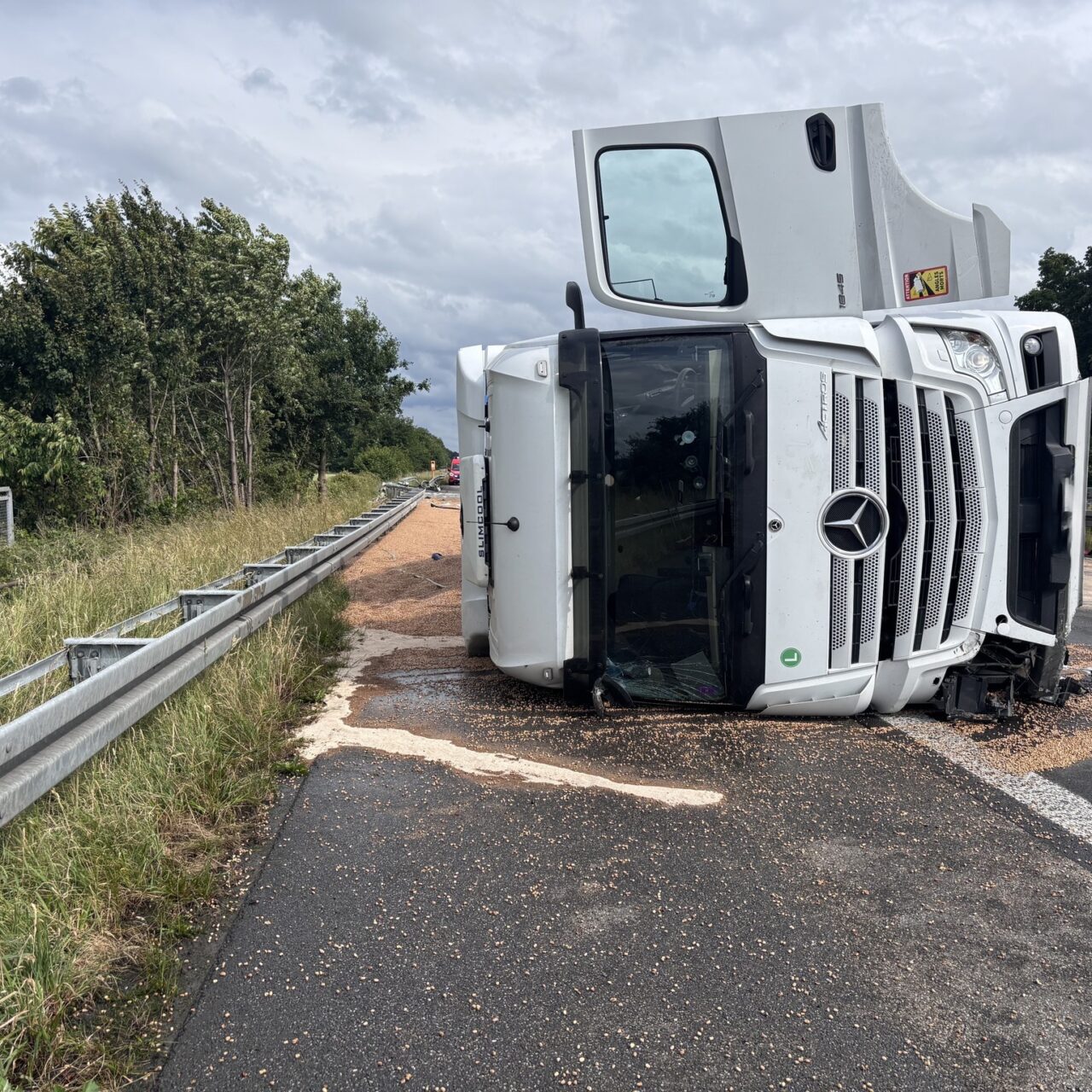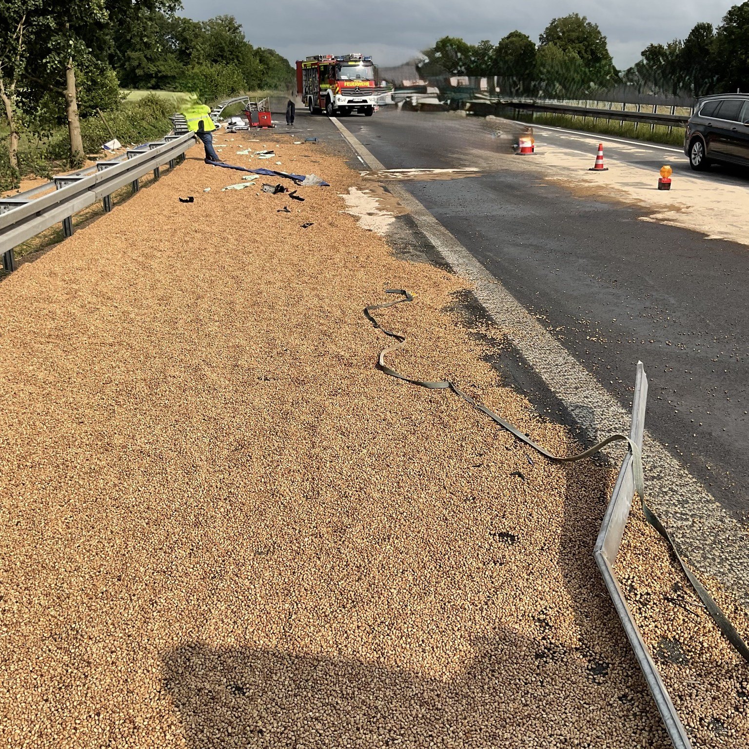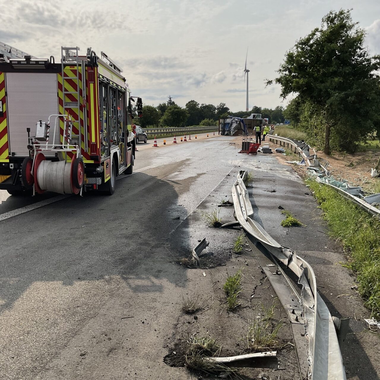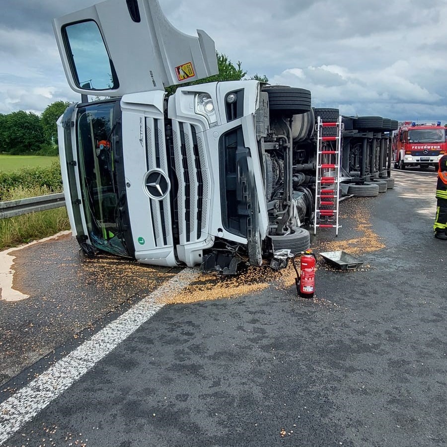 Wir fuhren direkt auf die BAB 3 in Fahrtrichtung NL und wurden dabei von der Löschgruppe Wertherbruch, dem ELW 1 sowie dem LöschzugDingden unterstützt. Anrufer hatten einen brennenden LKW mit einer eingeklemmten Person gemeldet. Vor Ort gab es einen Eigenunfall eines LKW. Der Fahrer war nicht eingeklemmt und ein Brand war durch Passanten bereits mit einem Handfeuerlöscher gelöscht worden. Der Rettungsdienst übernahm sofort die Versorgung des Patienten. Wir sicherten die Einsatzstelle gegen den Verkehr ab, stellten den Brandschutz sicher und nahmen weitere Sicherungsmaßnahmen am Lkw vor. Durch den Unfall wurde der Tank des LKWs beschädigt, wodurch größere Mengen Betriebsmittel ausströmten. Der Löschzug Dingden übernahm die Logistik und versorgte uns auf der Autobahn mit weiterem Material. Nach Rücksprache mit der Polizei wurde der Verkehr langsam an der Einsatzstelle vorbeigeführt. Nachdem ein Abschleppunternehmen an der Einsatzstelle eingetroffen waren, konnten wir die Einsatzstelle übergeben und einrücken. Insgesamt waren etwa 40 Kräfte für 2,5 Stunden im Einsatz.