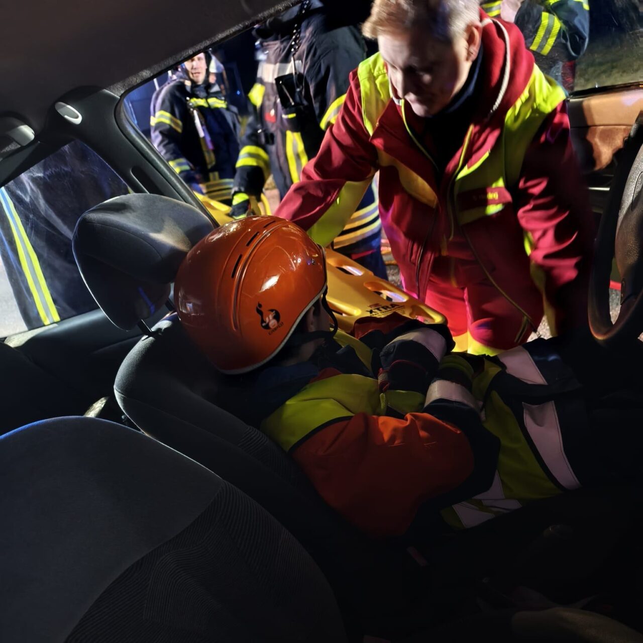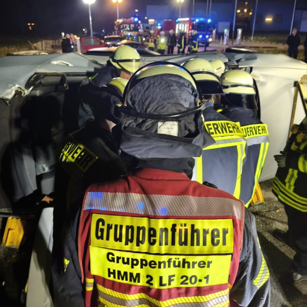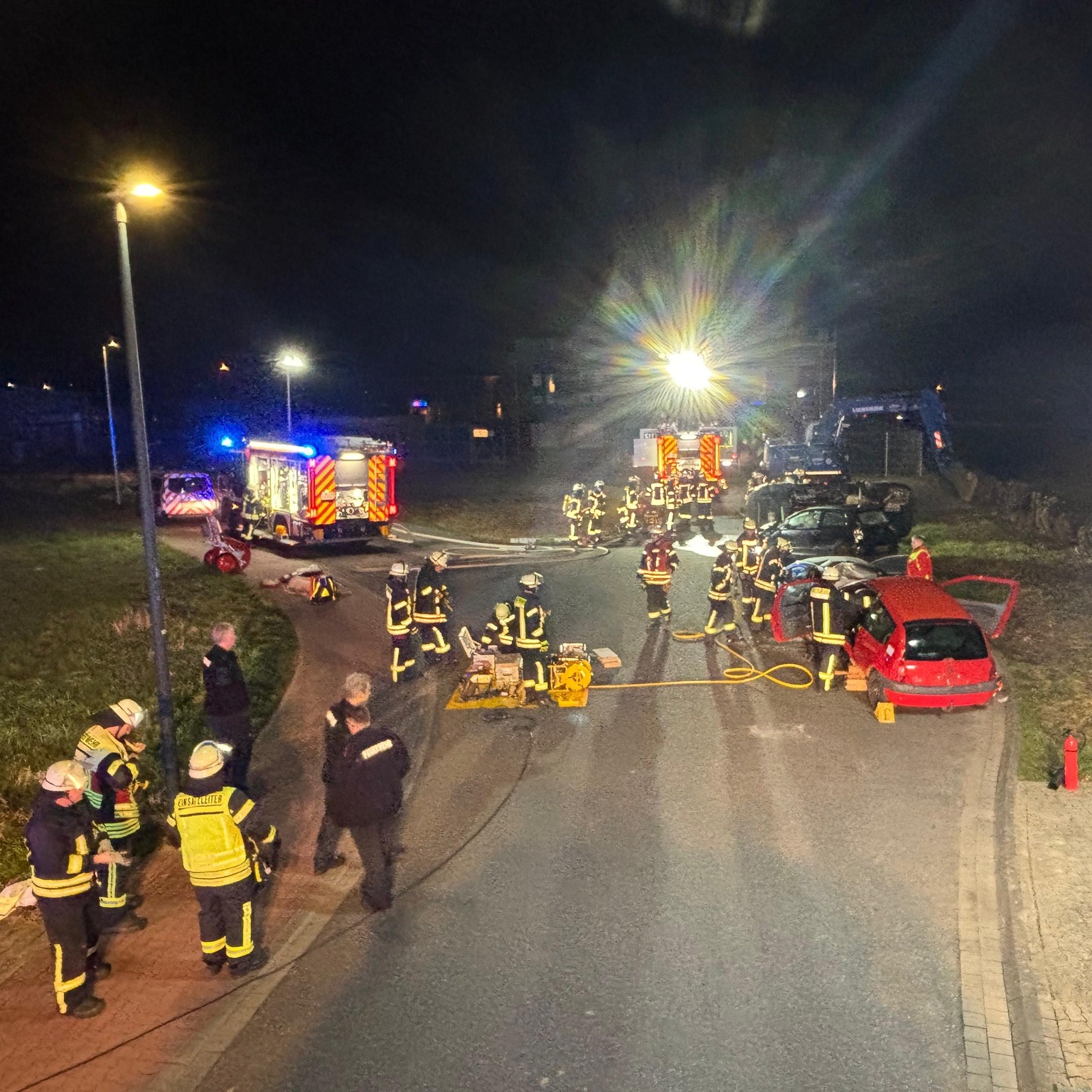 Mit dem Stichwort „H3Y- P-klemmt“ wurden wir gemeinsam mit der Löscheinheit Dingden, dem ELW der Löscheinheit Brünen und dem DRK Dingden zum Weikenrott alarmiert. Vor Ort fanden wir bei der Erkundung einen Verkehrsunfall mit fünf beteiligten Fahrzeugen vor. In drei Pkws waren teilweise mehrere Personen eingeklemmt. Ein weiterer Pkw brannte. Auch ein Bagger war an dem Unfall beteiligt. Somit wurden mehrere Einsatzabschnitte gebildet, sodass die Absicherung und das Ausleuchten der Einsatzstelle, die Versorgung und Betreuung der Betroffenen Personen sowie der Löschangriff parallel abgearbeitet werden konnten. Nachdem die Fahrzeuge gesichert worden waren, konnten wir zudem ebenfalls parallel mit der technischen Rettung der eingeklemmten Personen beginnen. Ebenso wurden auslaufende Betriebsstoffe abgebunden und die Fahrbahn gereinigt. Über den ELW wurden zusätzliche Einheiten des Rettungsdienstes unter dem Stichwort „Massenanfall von Verletzten, kurz MANV“ nachgefordert.